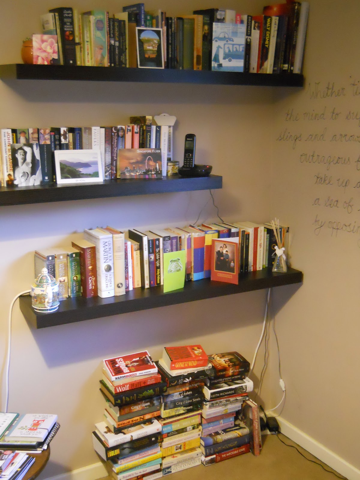 The principal disadvantage of gaining three new books is that is forces me to confront the literary chaos that completely dominates my life. Despite years of trying, I am still unable to exercise any kind of control over my expanding library. When I moved into my own flat two years ago, I was excited by the prospect of obtaining some sort of order – primarily in the form of some amazing floating bookshelves. These shelves were stacked with the best of intentions. But as they began to groan under the weight of my passion, I could not prevent the chaos seeping back into my life. Stacks of books started to materialise anywhere and everywhere. Every room, every shelf, any available floor space. Order and chaos. What’s a girl to do?